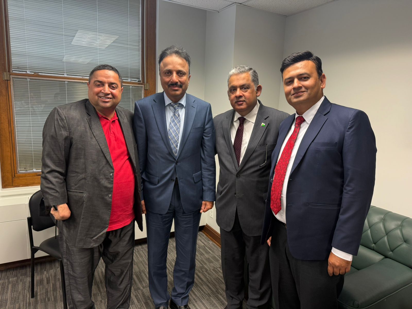 Mr. Abid Lashari President of NDF Pakistan is seen meeting with H.E Rizwan Saeed Sheikh Pakistan Ambassador to the United States of America, Mr. Tariq Kareem Consulate General of Pakistan Consulate General Chicago and Mr. Faisal Malik in Chicago USA.